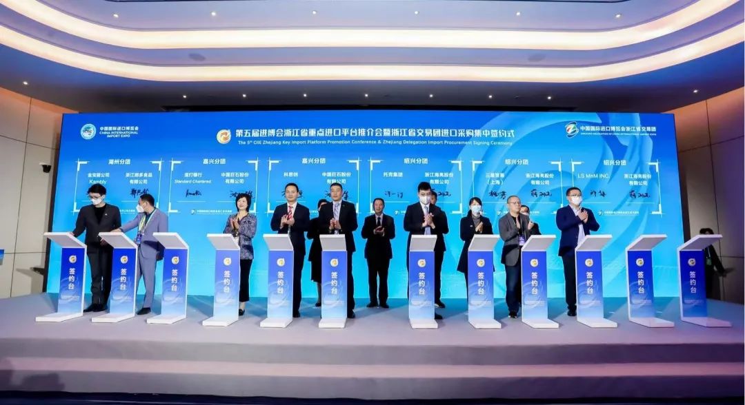 11月6日上午,第五屆進博會浙江省重點進口平臺推介會暨浙江省交易團進口采購集中簽約式在上海舉辦。海亮股份獲授“第三批浙江省重點進口平臺”牌匾,并作為紹興市交易團簽約企業(yè)代表上臺簽約。
